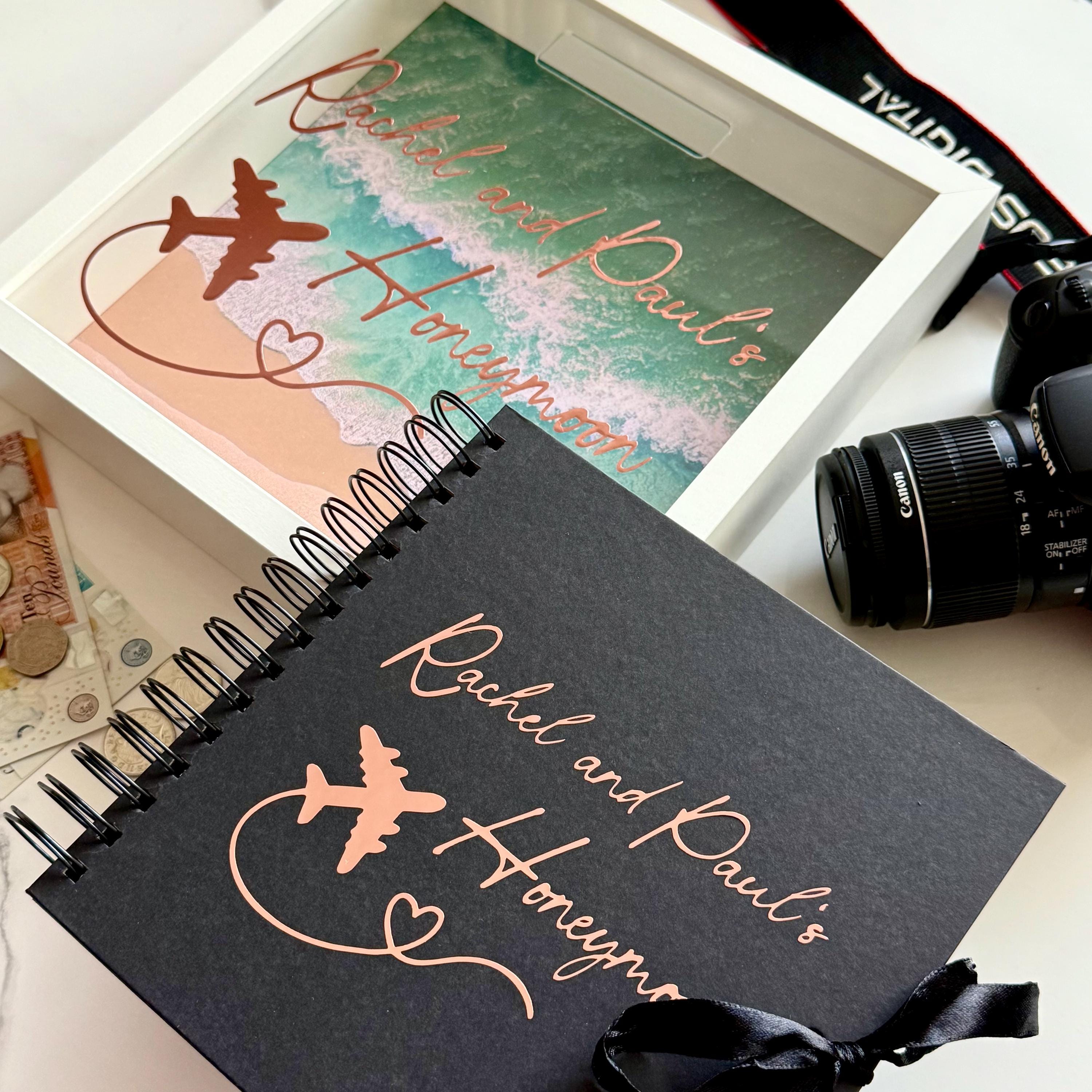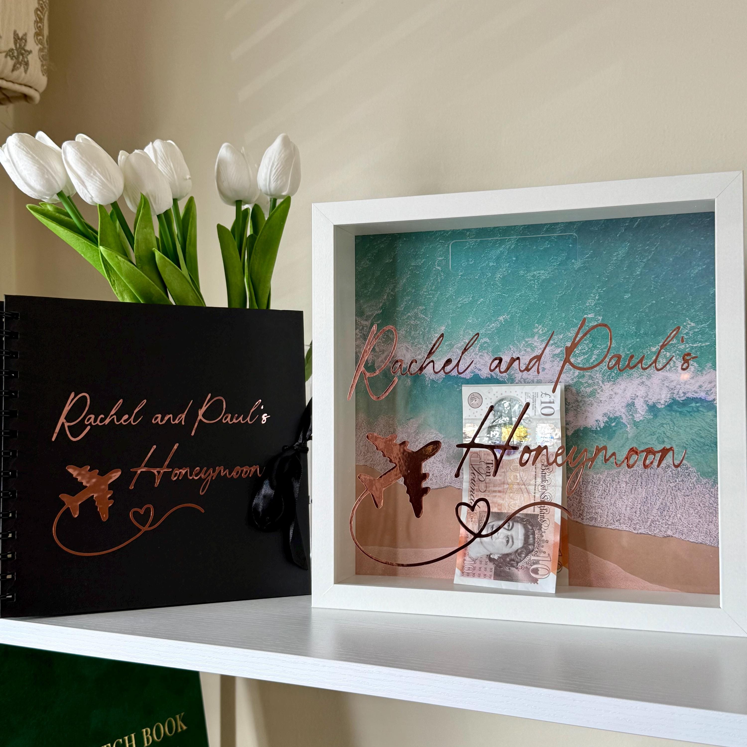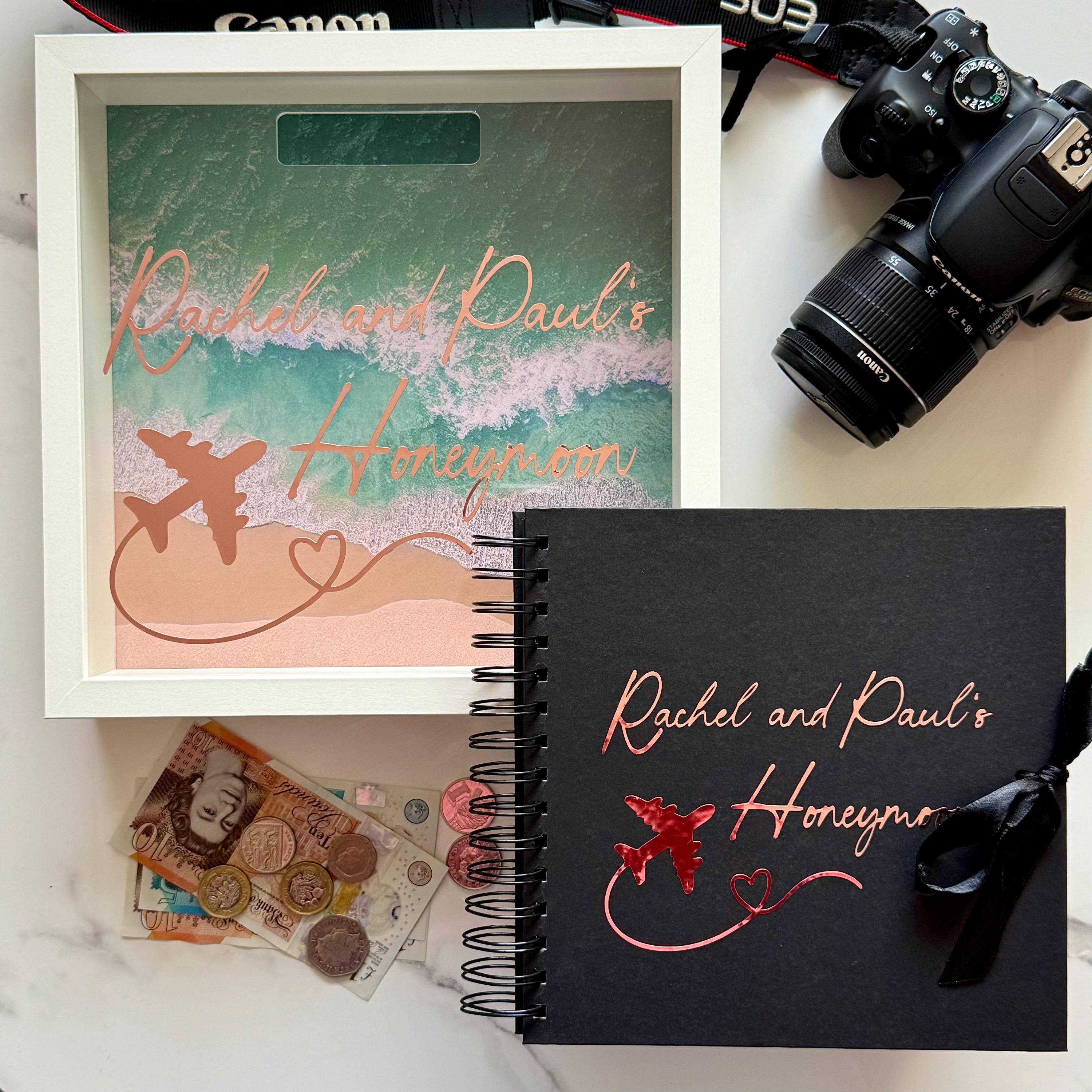 Celebrate the start of a beautiful journey with a Personalised Honeymoon Fund Money Box Frame and matching Scrapbook/Photo Album. The perfect engagement or wedding gift, or a functional purchase for the happy couple themselves!