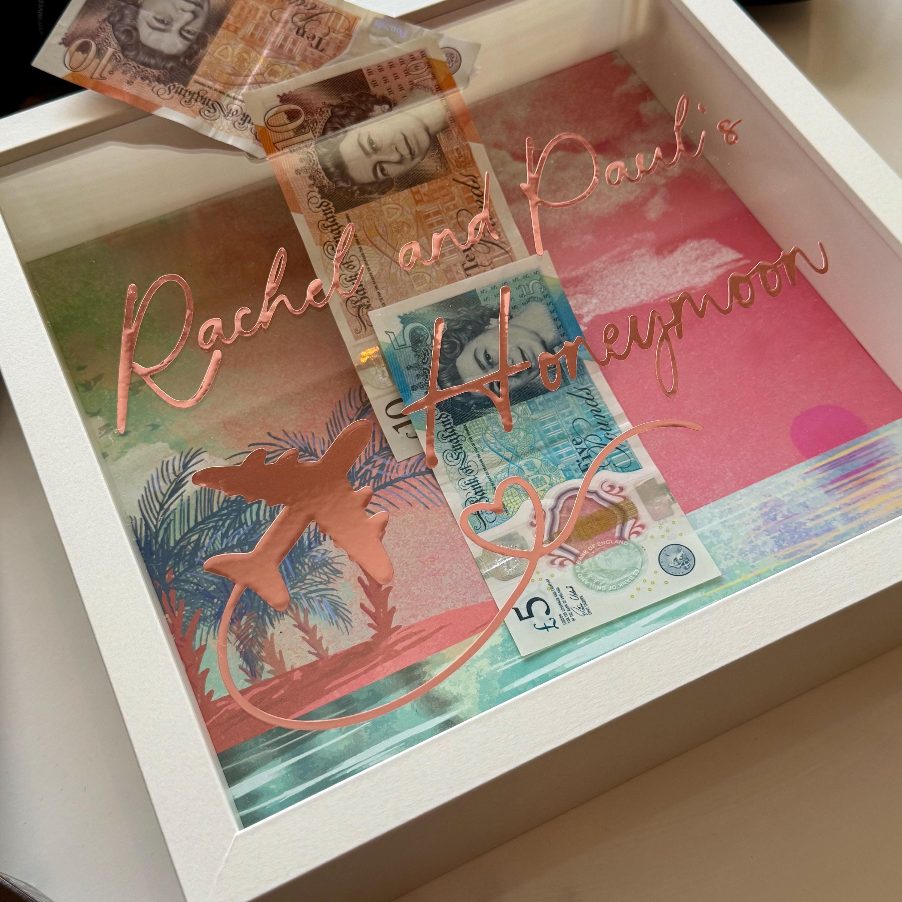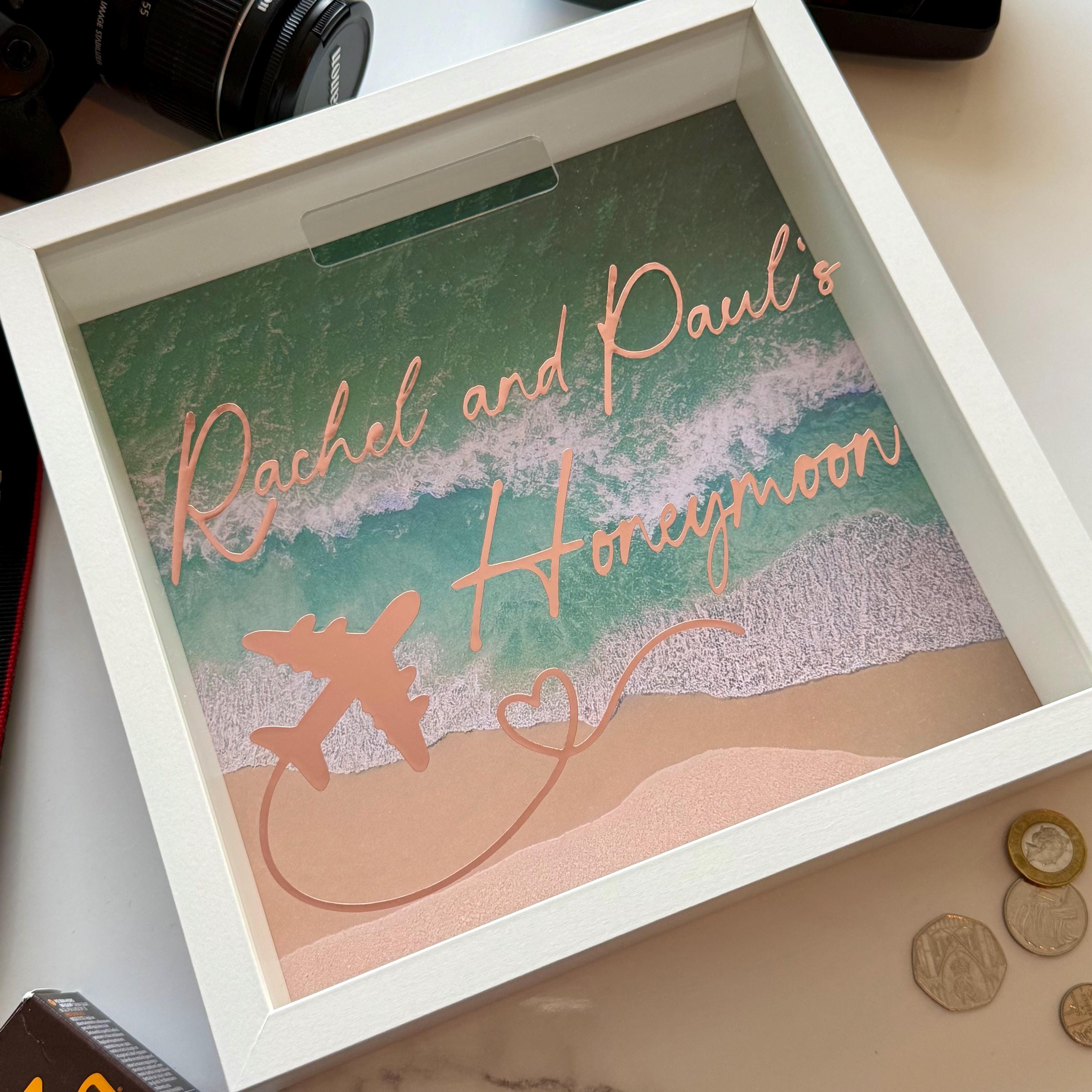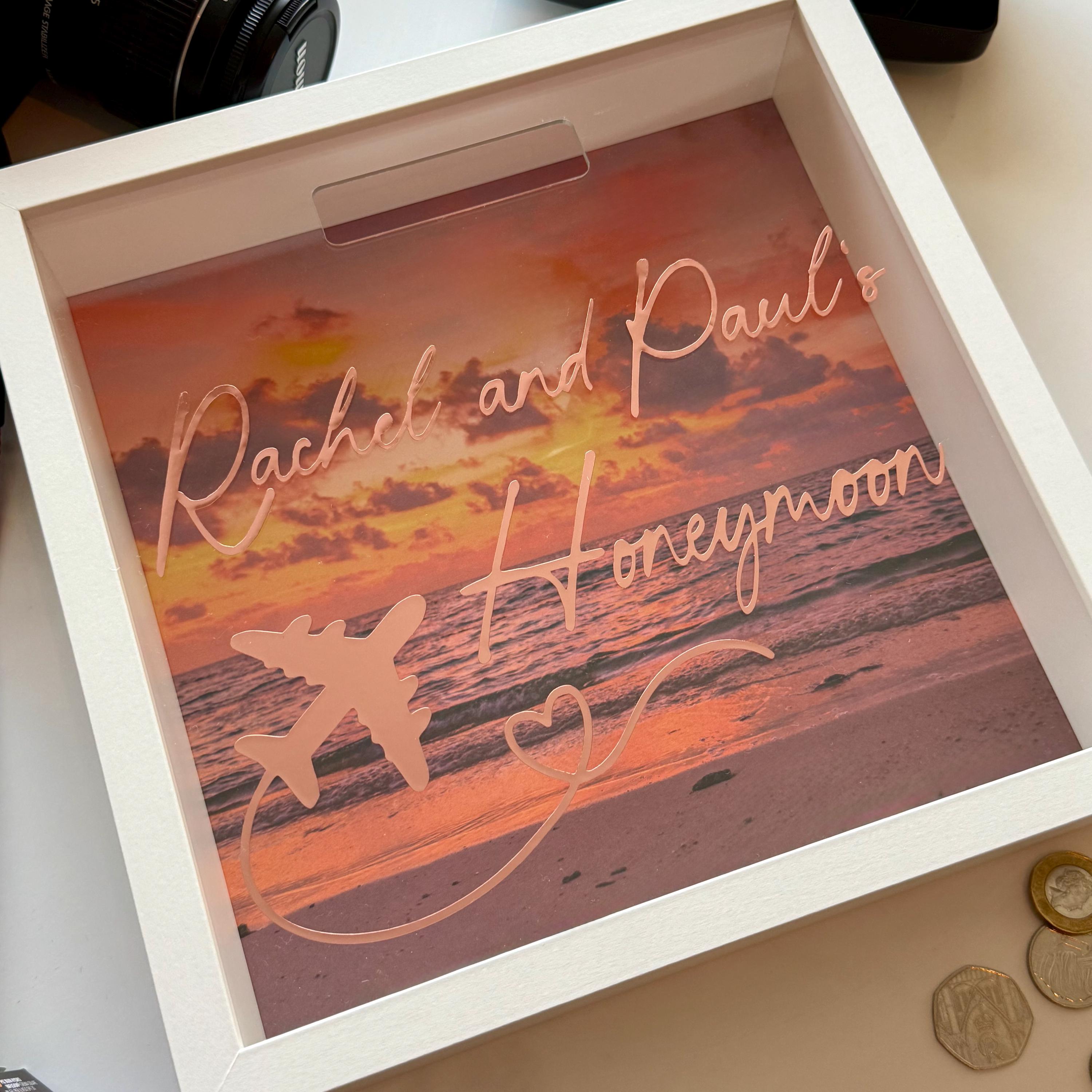Celebrate the start of a beautiful journey with a Personalised Honeymoon Fund Money Box Frame and matching Scrapbook/Photo Album. The perfect engagement or wedding gift, or a functional purchase for the happy couple themselves!
