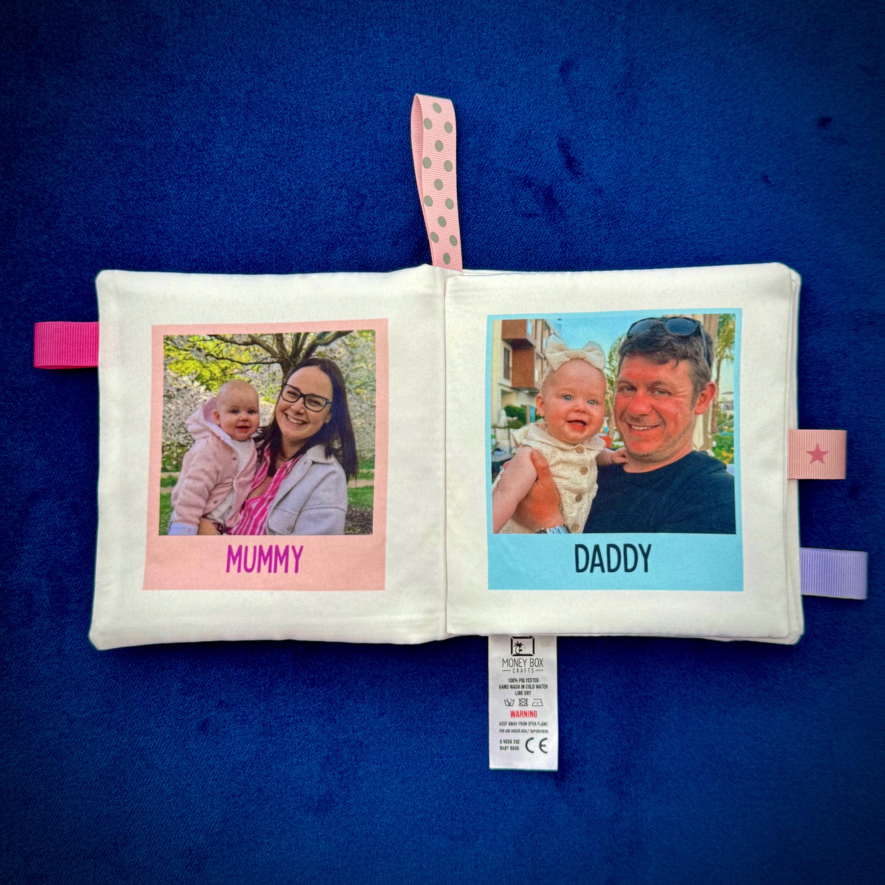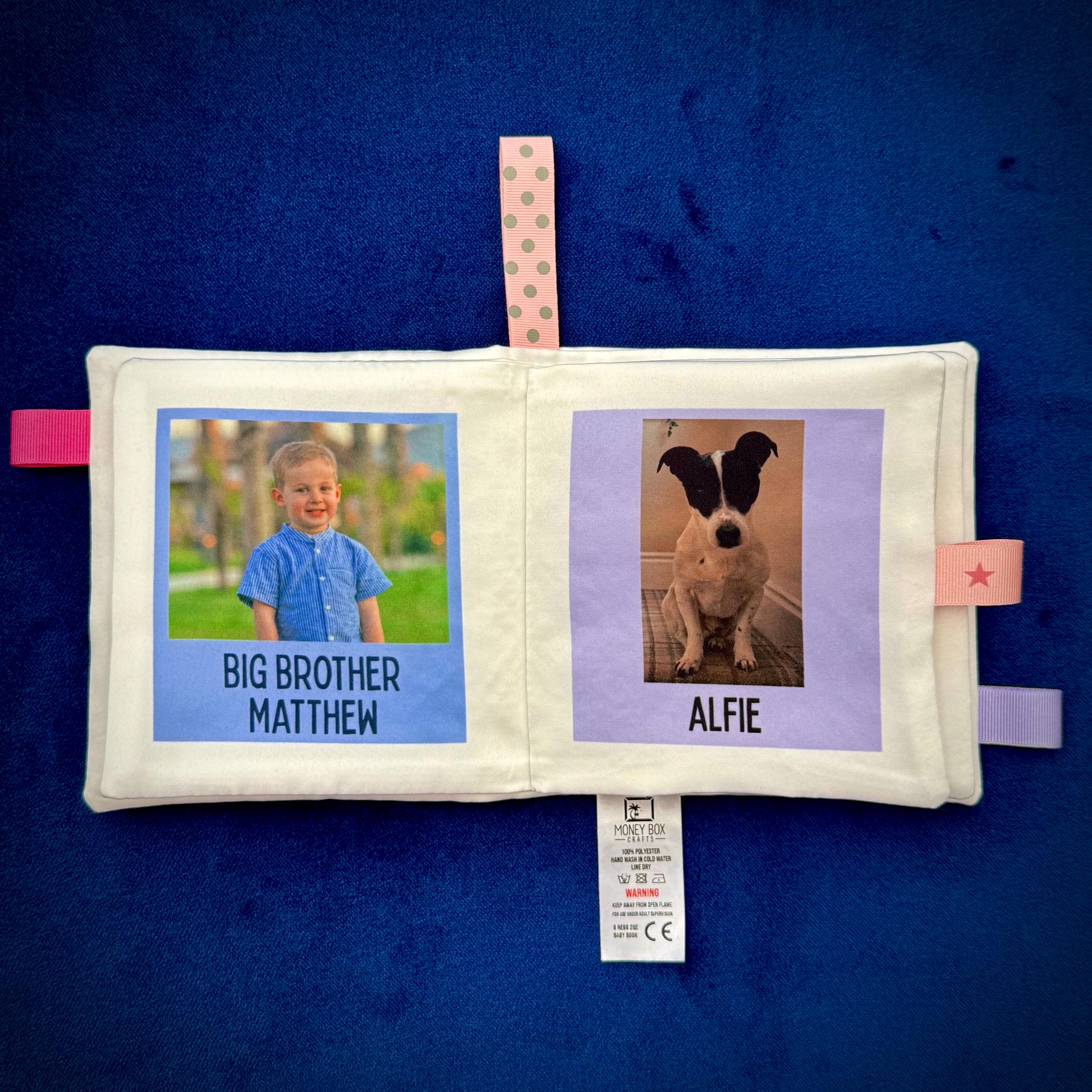 Sensory features like ribbons on the sides encourage tactile play and crinkly pages offer stimulating sounds to engage curious hands and ears. Each book is lovingly crafted to order, with your own photos and text.