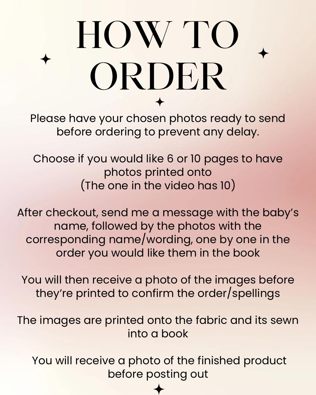 - After checkout, please send me a message via Etsy with the baby’s name, followed by photos with the corresponding wording sent one by one in the order you would like them in the book. Please provide high quality photos to ensure the image quality on the book.