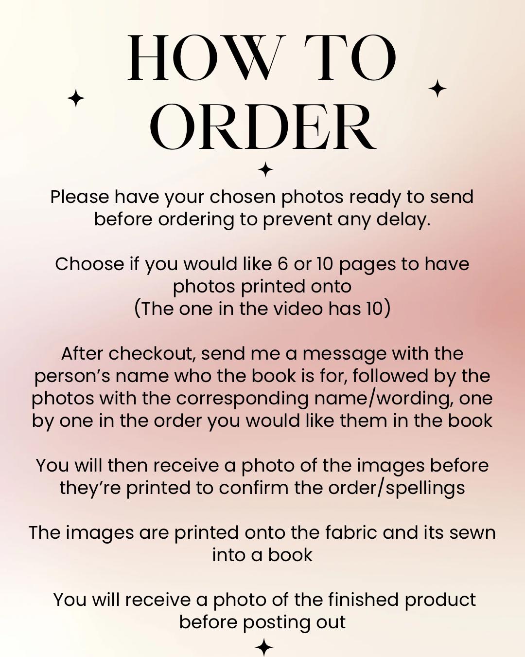 - After checkout, please send me a message via Etsy with the recipient’s name, followed by photos with the corresponding wording sent one by one in the order you would like them in the book. Please provide high quality photos to ensure the image quality on the book.